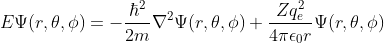 Where E is energy, m is mass, ħ is the Planck constant, ∇2 is the Laplace operator, Z is the atomic number, qe is the charge of the electron equal in magnitude to the that of the proton, Ɛ0 the vacuum permittivity constant, and (r, θ, ϕ) the spherical coordinates. Ψ is the wave function that when mapped produces the graphs in the previous figure. This is the Schrodinger equation with an electrostatic potential.