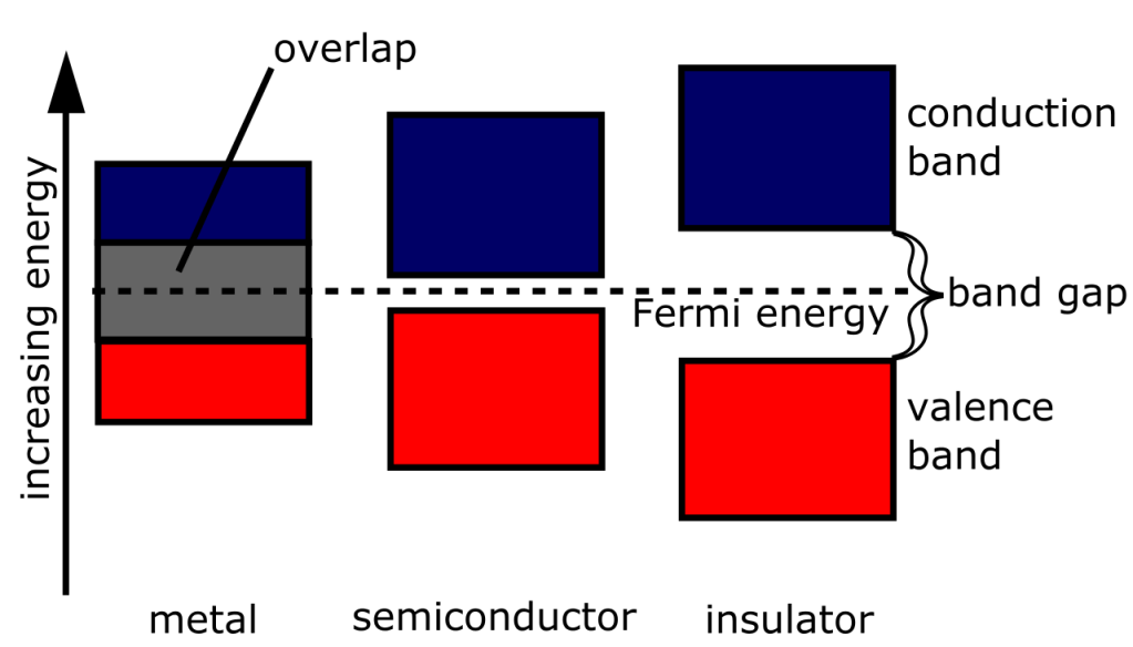 Now, every material varies by its conductivity. Conductivity is determined by how much energy is needed to promote the electron from its bound state to the atoms, called the valence band, to the level in which it can freely move, called the conduction band. The lower the amount of energy is needed to promote the electron – that is, the smaller the “band gap” – the more conductive it is. Conductors thus have a narrow to non-existent band gap, semiconductors are thus characterized by a small band gap, insulators by a large band gap.